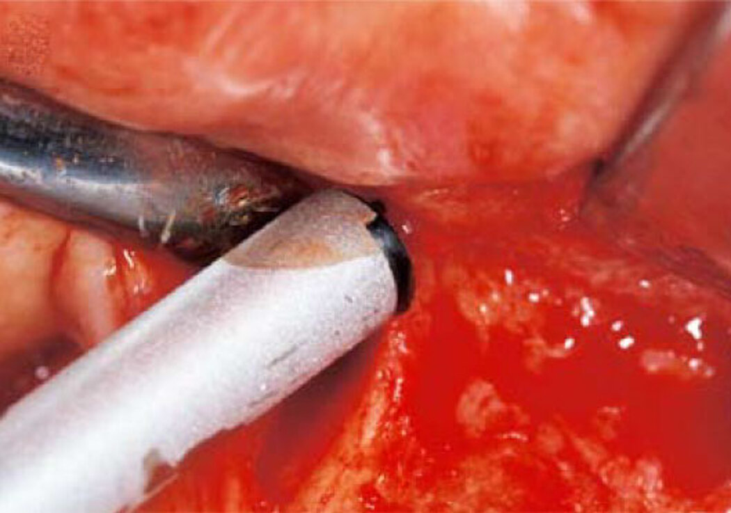 Its excellent cutting performance and narrow profile provides for easy bone collection at the defect site, as well as in other intraoral sites using a tunneling technique. This manual harvesting technique allows the graft to retain cell viability, which is essential for graft integration.6,7 The bone tissue is directly collected with coagulated blood making the graft easy to handle and mold to the defect shape. The collected bone shavings are mixed with blood, which can be combined with Geistlich Bio-Oss® or Geistlich Bio-Oss Collagen® to ensure volume preservation.