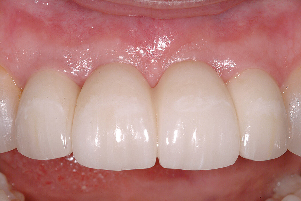 Minimal horizontal bone loss and widening of the keratinized gingiva thanks to Ridge Preservation with Geistlich Bio-Oss® Collagen and Geistlich Bio-Gide® Shape. On the regenerated side 3 months postoperative the red-white esthetics are just as good as on the natural tooth side.
